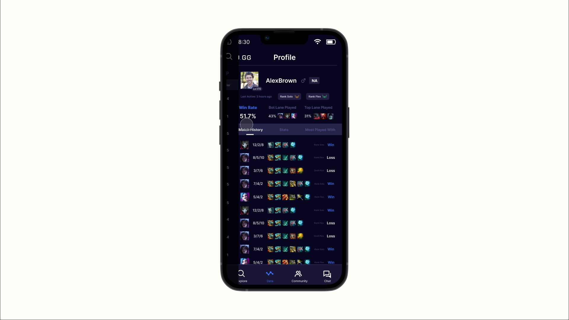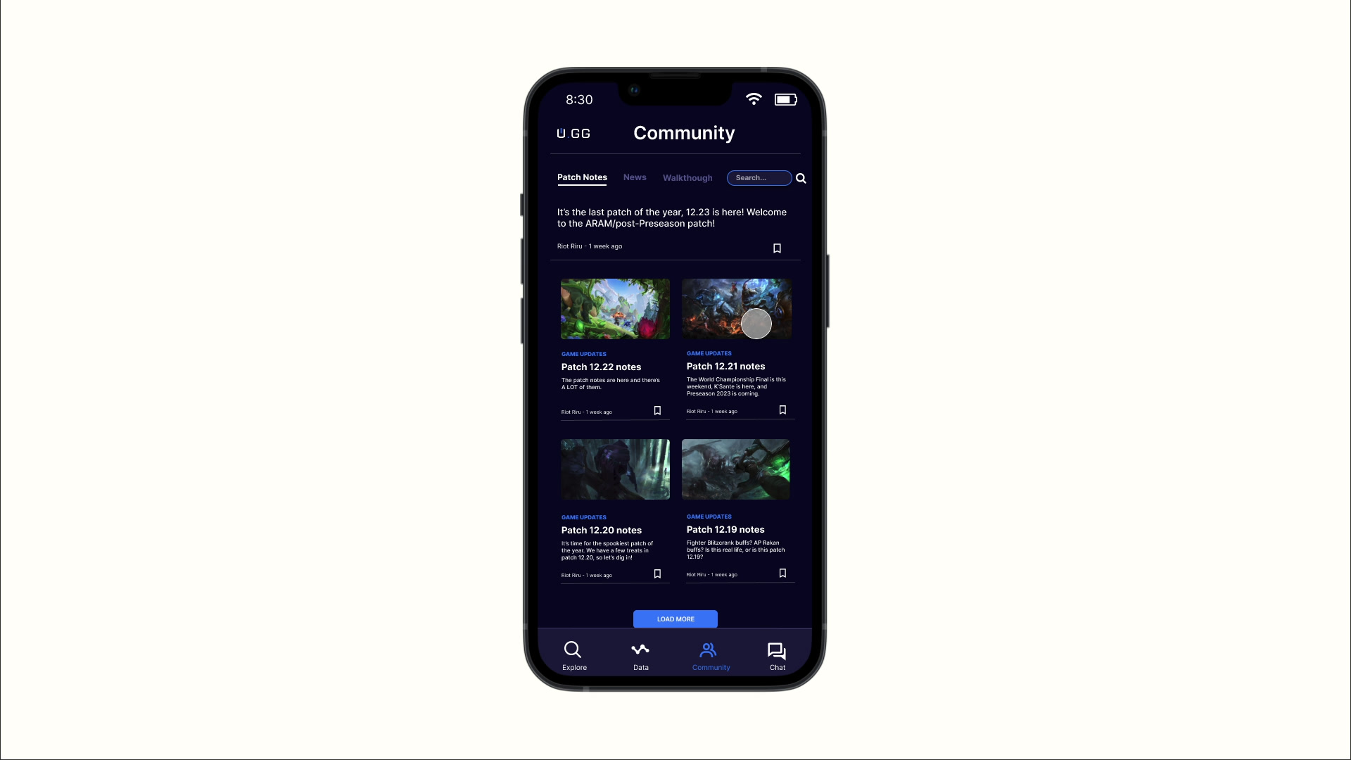 Based on our research and understanding of U.GG, we decided to follow the current PC structure and the layer of the common functions, and add the chatting, independently browsing the patch notes, edit user profile, etc., features as a different mode for the existing interface.